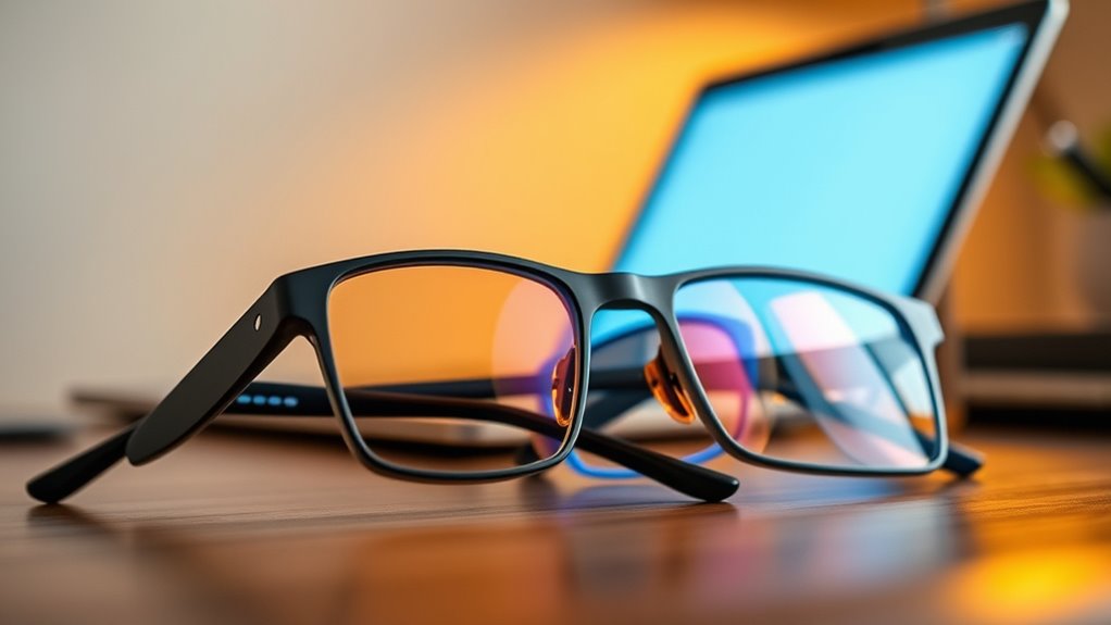 Choosing the right lens material and coatings is essential for maximizing comfort and protection with blue-light‑blocking glasses. Materials like polycarbonate or TR90 are lightweight, durable, and comfortable for extended wear. Coatings such as anti-reflective (AR) layers reduce glare and reflections that can cause eye strain, especially during long screen sessions. Dual AR coatings, applied on both sides, further minimize reflections into your eyes and outward reflections, boosting visual clarity. The lens tint, often amber or red, filters specific wavelengths of blue and green light, offering improved protection and supporting better sleep. High-quality coatings and suitable lens materials not only enhance blue light filtration but also extend the lifespan of your glasses, ensuring consistent protection and comfort over time.