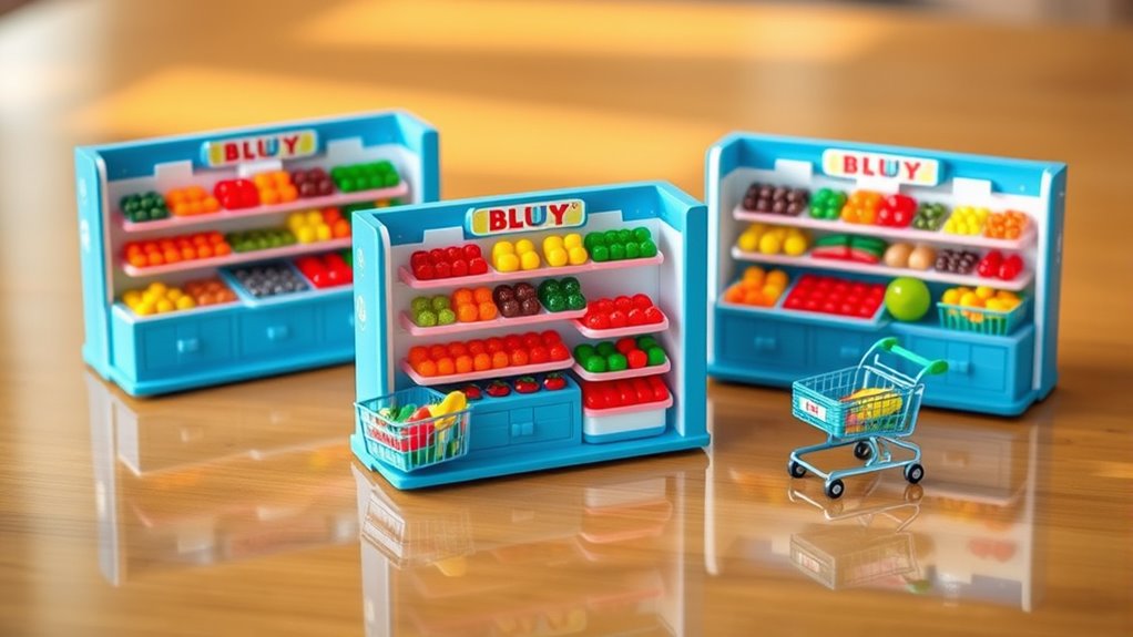 Considering the variety and number of accessories included in a Bluey supermarket playset is essential, as these extras considerably enhance creative play. Items like shopping carts, stickers, and paper decorations encourage kids to build immersive scenarios and role-play more vividly. Customization options, such as stickers and paper pieces, allow children to personalize their supermarket environment, making play more engaging. It’s also important to check if the accessories are compatible with existing Bluey figures, which maximizes play potential. Additionally, look for sets that offer interactive elements like signs or decorations that can be rearranged or personalized, adding variety and depth to the play experience. A well-equipped set with diverse accessories supports extended imaginative scenarios, making playtime both fun and meaningful.