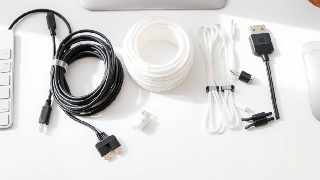 Choosing the right cable management kit involves more than just strong adhesion; it also requires adaptability and flexibility to handle various setups. A good kit should include a range of components like sleeves, clips, ties, and mounts to accommodate different cable sizes and configurations. Flexibility in installation methods, such as self-adhesive options and adjustable straps, allows me to use the kit on different surfaces without needing specialized tools. The ability to link or extend components, like connecting multiple ties or customizing sleeve lengths, makes it easier to manage complex cable arrangements. A thorough kit with diverse accessories ensures I can manage cables across multiple devices—computers, TVs, and office equipment—making it a versatile, long-term solution for evolving needs.