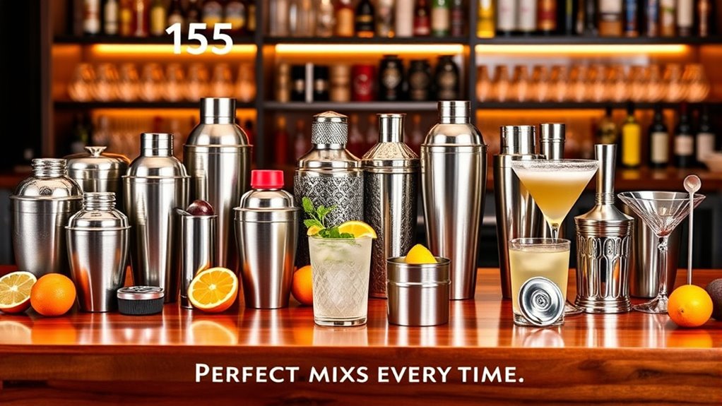 Choosing the right cocktail shaker set is key for perfectly mixed drinks every time. I look for sturdy, rust-resistant stainless steel, ideally with a size around 18-24 oz. for versatility. A complete set with essential tools like jiggers, strainers, and muddler helps me craft a variety of cocktails easily. If you stick with me, I’ll guide you through top options that combine quality, style, and value for your home bar.
