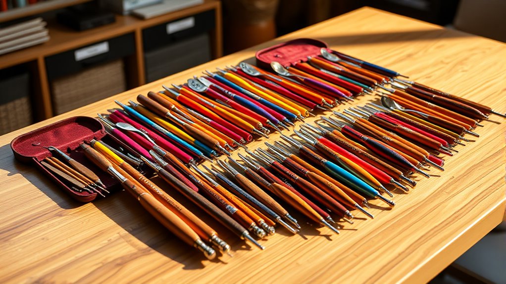 To keep my crochet hooks in great shape, I regularly clean them with mild soap and warm water, avoiding harsh chemicals. I store them in a dedicated pouch or case to prevent damage and tangling. When not in use, I keep them in a safe, dry place to avoid rust, especially for metal hooks. Proper care guarantees my hooks stay smooth and reliable for all my projects.