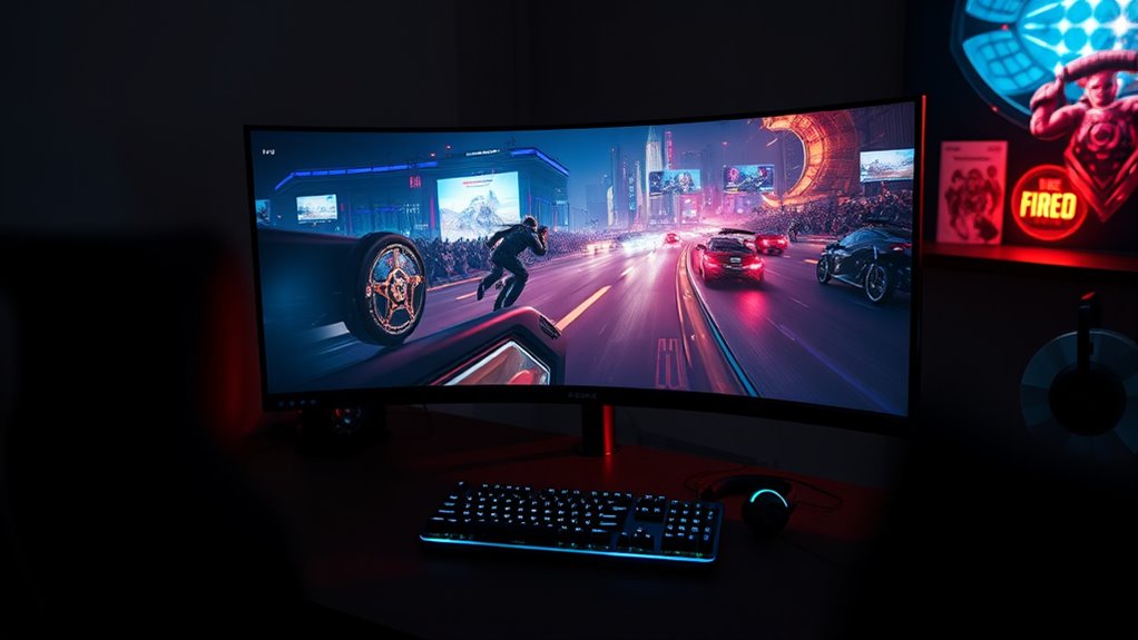 Curved screens enhance multiplayer gaming by creating a more immersive environment, making you feel like you’re inside the game world. They help reduce glare and distortion from side angles, so you stay engaged with minimal distractions. I find that the curvature improves peripheral vision, giving me a slight edge in fast-paced games. Overall, they boost immersion and focus, making multiplayer sessions more exciting and competitive.