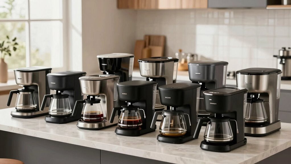 If you’re searching for the 15 best drip coffee makers for 2026, I’ve got you covered. From compact options like the Amazon Basics 5-Cup to advanced models such as the Hamilton Beach 12-Cup Programmable or the Bonavita with its thermal carafe, there’s something for every coffee lover. Consider features like capacity, programmability, and brewing technology to find your perfect match. Keep going, and you’ll discover detailed comparisons to help you pick the ideal machine.