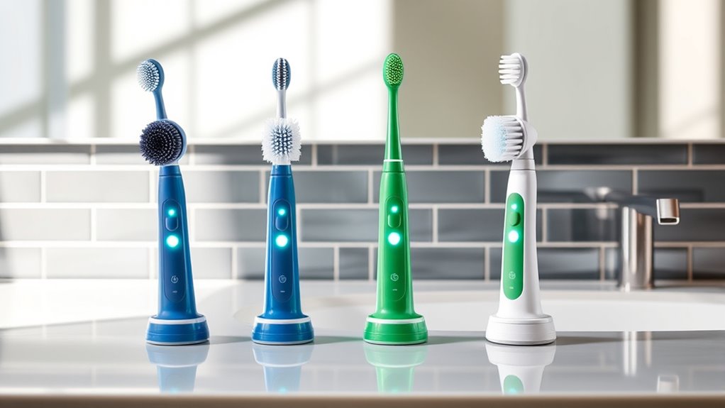 A wide range of brush heads considerably enhances an electric spin scrubber’s versatility, allowing me to customize my cleaning based on the surface and task. Round heads work well on curved surfaces, while flat heads are perfect for tiles and grout. Multi-purpose brushes let me clean glass, ceramic, and metal without scratching. Different bristle stiffness options help me tackle delicate surfaces or stubborn stains effectively. I also appreciate specialized attachments like corner or sponge heads that reach tight spots and handle detailed cleaning. Having multiple brush heads makes the scrubber more efficient and adaptable, ensuring I can handle various cleaning challenges with ease. This variety not only improves performance but also extends the lifespan of the device by matching the right brush to each task.
