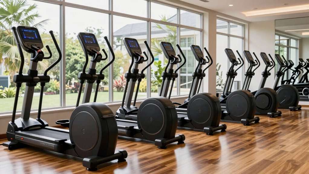 Ever wonder how much noise your elliptical might make during a workout? Noise levels vary, but quiet models typically operate around 20-26 decibels, ideal for shared spaces or noise-sensitive environments. Belt-drive resistance systems are usually quieter than chain-drive ones, providing a smoother workout with less sound. Magnetic resistance mechanisms are nearly silent, making them perfect for quiet home gyms. Features like insulated covers and vibration-absorbing materials can further dampen operational noise. Keep in mind, noise can ramp up with higher resistance or vigorous exercise, so choosing a machine with adjustable resistance and noise control features is smart. Ensuring your elliptical has these quiet operation features will help you work out without disturbing others or feeling self-conscious about noise.