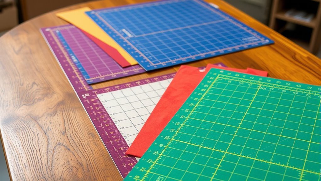 Accurate measurement is crucial when selecting a fabric cutting mat because it directly impacts the precision of your cuts and pattern alignment. I look for mats with clear, contrasting measurement markings, like grid lines and angle guides, to minimize errors. Double-sided mats with both imperial and metric units are great, as they guarantee compatibility with different standards and boost accuracy. Well-designed guides, including 30°, 45°, and 60° angles, help me achieve precise angled cuts and align patterns correctly. Durability is also key; I prefer mats with grid markings that won’t fade or wear off over time, maintaining their accuracy through repeated use. Overall, reliable measurement features are vital for consistent, precise fabric projects.