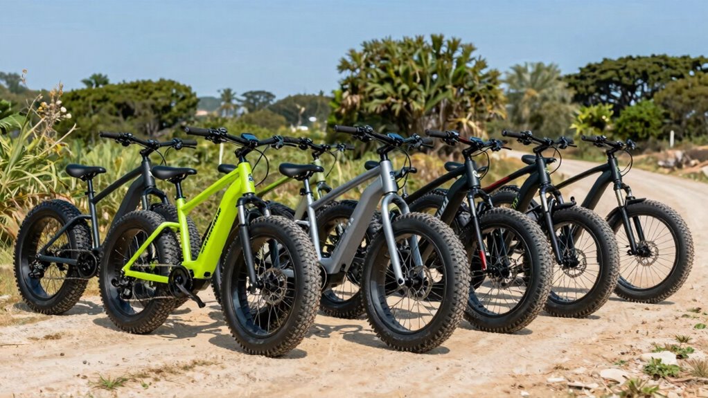 Fat tire electric bikes handle snowy and muddy conditions surprisingly well. Their wide tires provide extra stability and grip, allowing me to navigate tricky terrains without slipping. The larger contact patches distribute weight more evenly, which helps in loose or uneven surfaces. I find they’re especially effective in winter and off-road adventures, giving me confidence to ride through snow and mud where narrower tires might struggle or get stuck.
