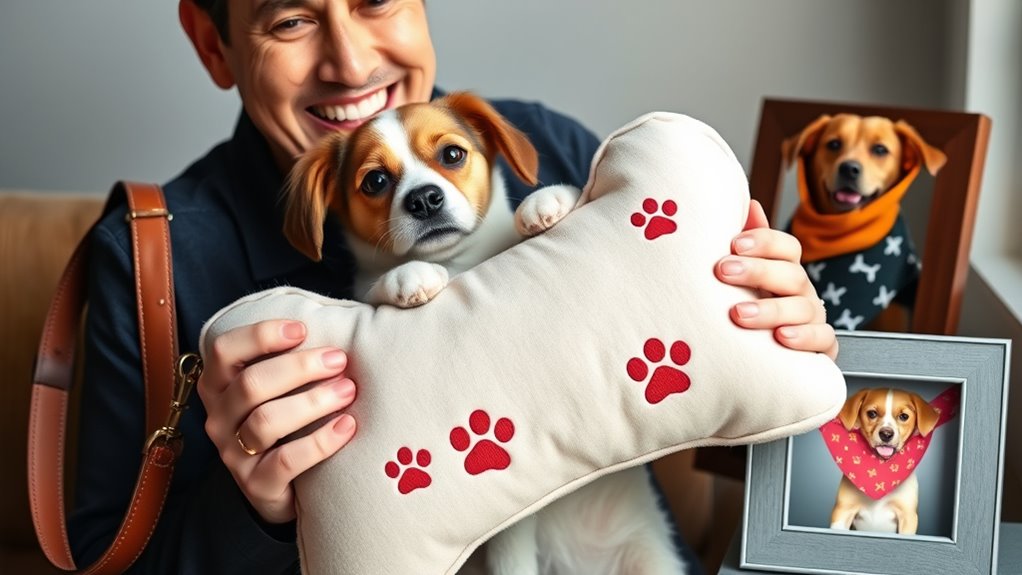 Ever wondered how personalized gifts can deepen the bond between dog lovers and their furry friends? Personalization options let you create meaningful keepsakes, like engraved keychains or monogrammed ornaments, that truly resonate. Adding a pet’s name, photo, or a heartfelt message boosts emotional connection and makes the gift special. You can also tailor items to reflect the recipient’s dog breed, personality, or unique traits, increasing sentimental value. Choosing colors, designs, or inscriptions that match their taste or home decor shows thoughtfulness and effort. Personalized gifts stand out because they’re unique and meaningful, making them more than just typical dog-themed items. They become treasured mementos that celebrate the special bond shared with their beloved pet.