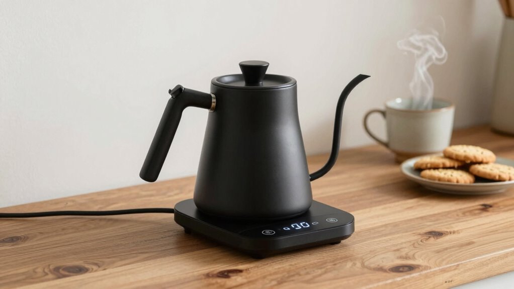 Most electric gooseneck kettles I’ve looked into still require a cord during pouring, but some models now feature cordless bases for easy handling. Imagine pouring your coffee with freedom, no tangled cords to worry about. These cordless options give you a sleek, hassle-free experience. While not all models are cordless, the latest designs are trending towards that convenience, making your brewing process smoother and more enjoyable.
