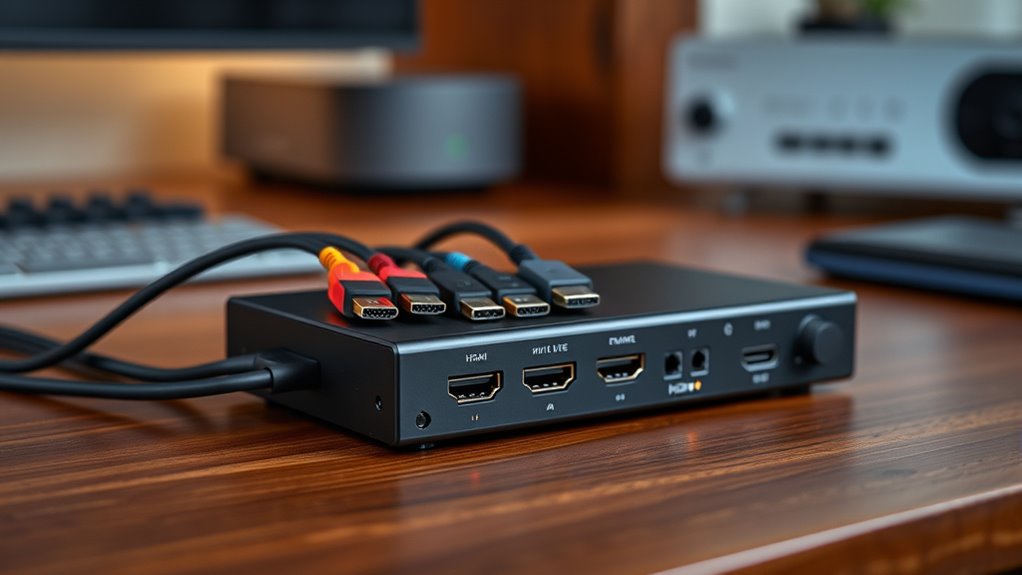 Choosing the right HDMI switcher can feel like finding a needle in a haystack, but it’s worth it for seamless device connections. Whether you need 2, 4, or even 8K support, the options today are more advanced than a rotary phone. Think of it as upgrading from a horse-drawn carriage to a Tesla—modern tech guarantees effortless switching and stunning visuals. Trust me, your setup will thank you for embracing these future-proof choices.