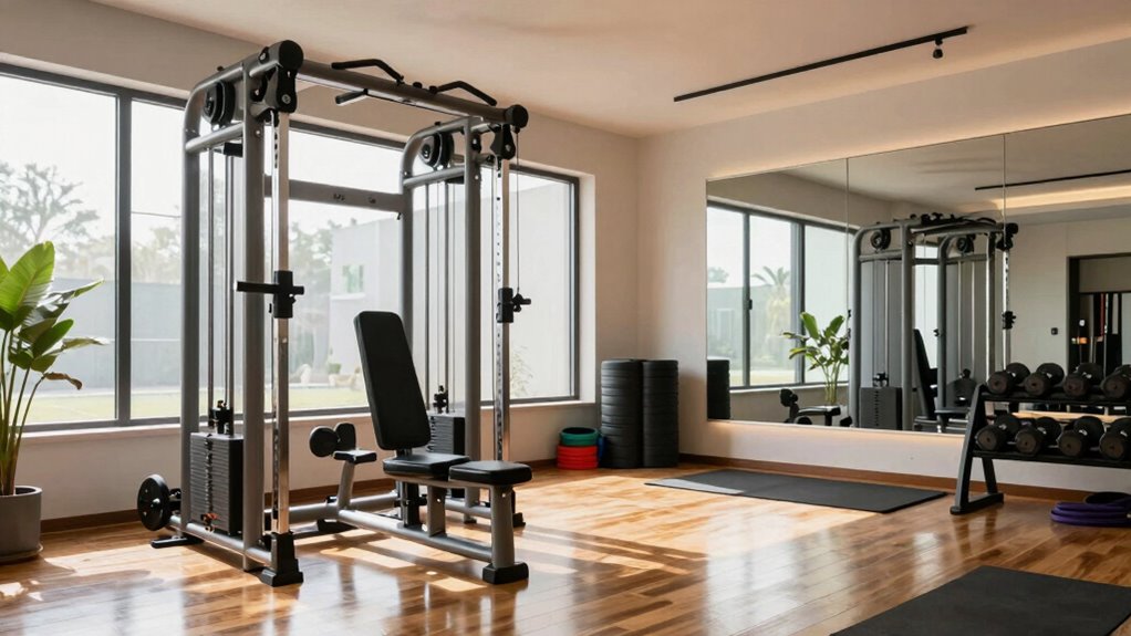 Choosing the right home gym system hinges on clearly defining your training goals, whether that’s building strength, boosting endurance, toning muscles, or a mix of these. I always start by identifying what I want to achieve, then look for a system with suitable resistance and exercise options. It’s important to guarantee the gym includes a variety of attachments and stations that target all major muscle groups relevant to my goals. I consider the maximum weight capacity and resistance levels to match my current strength and future progress. Adjustable components, like seat height or pulley positions, help me customize workouts and accommodate different exercises and user sizes. Ultimately, I evaluate whether the system supports full-body workouts or focuses on specific areas, aligning with my overall fitness ambitions.