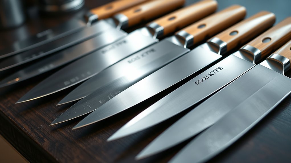 Maintaining Japanese chef knives properly is crucial to guarantee they stay sharp and resistant to corrosion. Hand washing and regular honing are essential to preserve their edge and prevent rust. High-quality steels like VG10 or 10Cr15Mov are durable and can last decades with proper care, maintaining their structural integrity. Knives with full tang construction and sturdy handles made from stabilized wood or G10 enhance durability and safety for long-term use. Regular sharpening with ceramic or diamond steels keeps the blade razor-sharp and prevents dullness. Additionally, avoiding dishwashers and storing knives securely in knife blocks or sheaths notably extends their lifespan. Investing time in proper maintenance ensures your knives remain reliable tools, providing consistent performance and longevity in your kitchen.