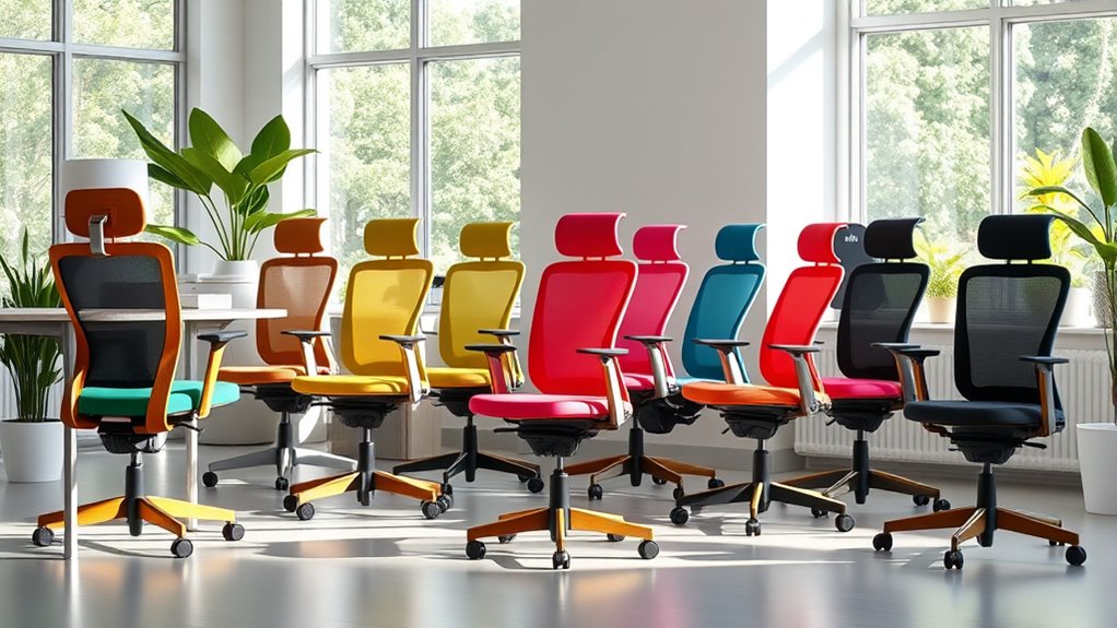 Choosing a kneeling chair with the right adjustability options is essential for achieving ideal comfort and ergonomic benefit. I look for models that let me easily change the seat height, often via pneumatic or screw-based systems, so I can align my hips and spine properly. Tilt and rocking functions are also important, especially if I want to move naturally and reduce stiffness during long sessions—many chairs let me lock or adjust these features. The range of height adjustments varies, with some chairs supporting from 21 to 35 inches, making them versatile for different desks and users. Additionally, adjustable knee pads or cushions help me customize pressure distribution and angle. Fully adjustable chairs enable me to find the perfect posture, minimizing strain and maximizing comfort throughout my workday.
