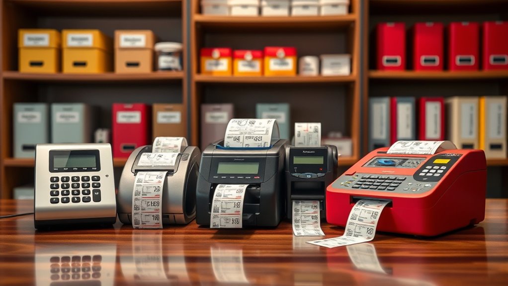 Have you considered how the printing technology impacts the durability and clarity of your labels? Thermal printing uses heat to create labels directly on specially coated paper, eliminating ink, toner, or ribbons. This makes it a quick option with smudge-resistant, durable labels perfect for busy environments. The resolution usually ranges from 203 to 300 DPI, influencing how sharp and detailed your labels appear. Inkless thermal technology is more cost-effective long-term but can be sensitive to heat and light, which might affect label longevity. On the other hand, thermal transfer printing offers longer-lasting labels on a variety of materials, ideal if you need labels that withstand harsher conditions. Your choice depends on the environment and the durability required for your labels.
