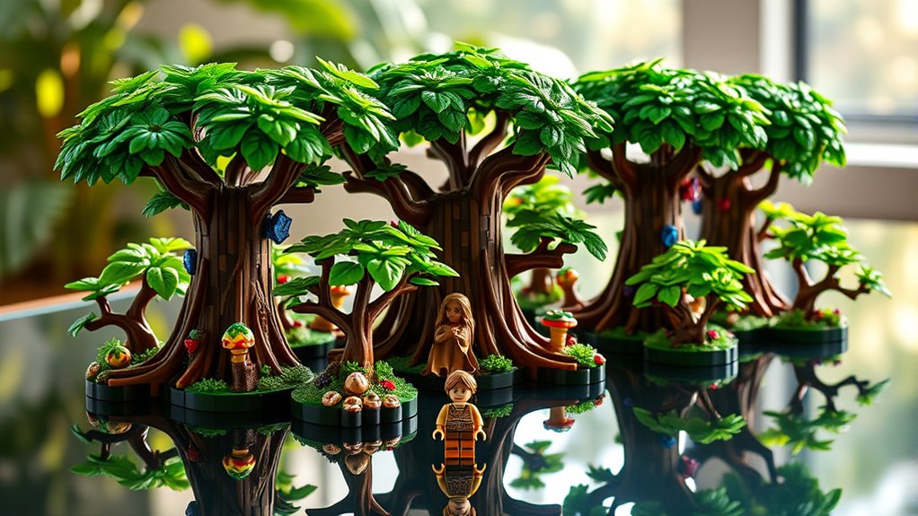 Enhancing your Lego Zelda Great Deku Tree set with the right lighting and display options can truly elevate its visual impact. Consider adding LED lighting to highlight the intricate details of the model; simple LED strips or advanced custom kits can create stunning effects. These lighting options are versatile, powered by USB or batteries, allowing flexible placement. To protect your display and keep it dust-free, clear acrylic cases are ideal—they offer full visibility while safeguarding your set. When choosing display accessories, match the size and theme to maintain a cohesive look that enhances the overall presentation. Proper lighting and thoughtful display choices can turn your LEGO Great Deku Tree into a striking centerpiece, perfect for showcasing your fandom at home, in the office, or on a shelf.