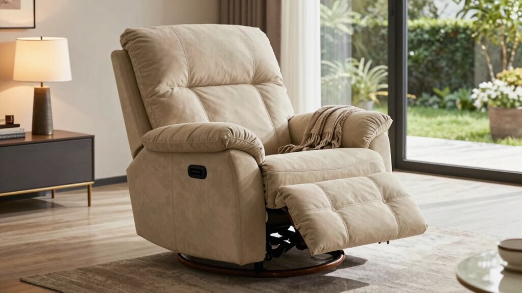 Safety features are vital in guaranteeing that elderly users can enjoy their lift chairs without unnecessary risk. Anti-tipping mechanisms help prevent falls and provide stability during use, giving both the user and caregiver peace of mind. Power lift functions should operate smoothly and gradually, reducing the chance of sudden movements that could cause injury. Emergency stop buttons or easily accessible controls are essential, allowing quick shutdown if needed. Non-slip, sturdy bases add extra stability and prevent the chair from sliding during adjustments. Additionally, automatic shut-off timers for massage and heating functions help prevent overheating, lowering the risk of burns or other injuries. Prioritizing these safety features guarantees a safer, more comfortable experience for elderly users.