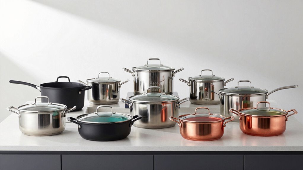 Choosing luxury cookware sets hinges on their material quality and durability, since these factors determine how well they withstand regular use. High-quality sets are usually made from stainless steel, copper, or hard anodized aluminum, which resist warping, scratching, and discoloration. These materials guarantee the cookware maintains its appearance and performance over time. Copper and multi-ply stainless steel are especially great for heat conduction, providing even and precise cooking control. Additionally, top-tier cookware often features non-toxic, eco-friendly coatings that enhance safety and prevent chemical leaching into food. The durability also depends on craftsmanship; well-made sets are designed to support frequent use without degrading. Investing in quality materials means your cookware will last, perform reliably, and keep looking stunning for years to come.