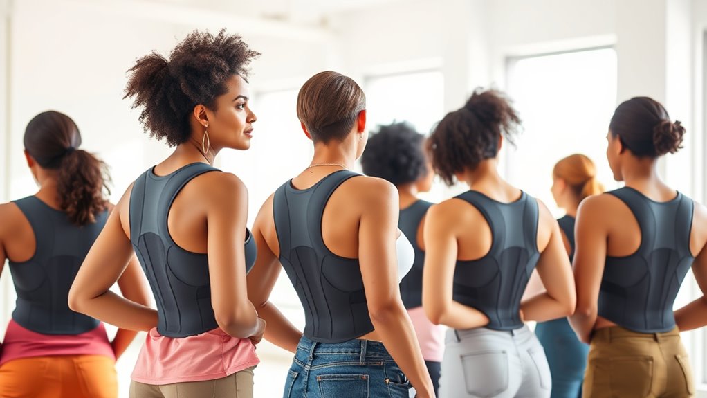 Adjustable support features are essential because they allow you to customize the fit of your posture corrector, guaranteeing it works effectively for your unique body shape and size. With adjustable straps and belts, you can tighten or loosen the brace to find the perfect balance between support and comfort. Multiple adjustment points, like shoulder straps, waist belts, and support bars, let you target specific postural issues such as slouching or rounded shoulders. Proper adjustability prevents over-tightening, which can cause soreness or restrict movement, and under-tightening, which diminishes the brace’s corrective benefits. These features also help keep the brace securely in place, reducing slipping or rolling up during daily activities. Ultimately, adjustable support ensures consistent, personalized posture correction without discomfort.