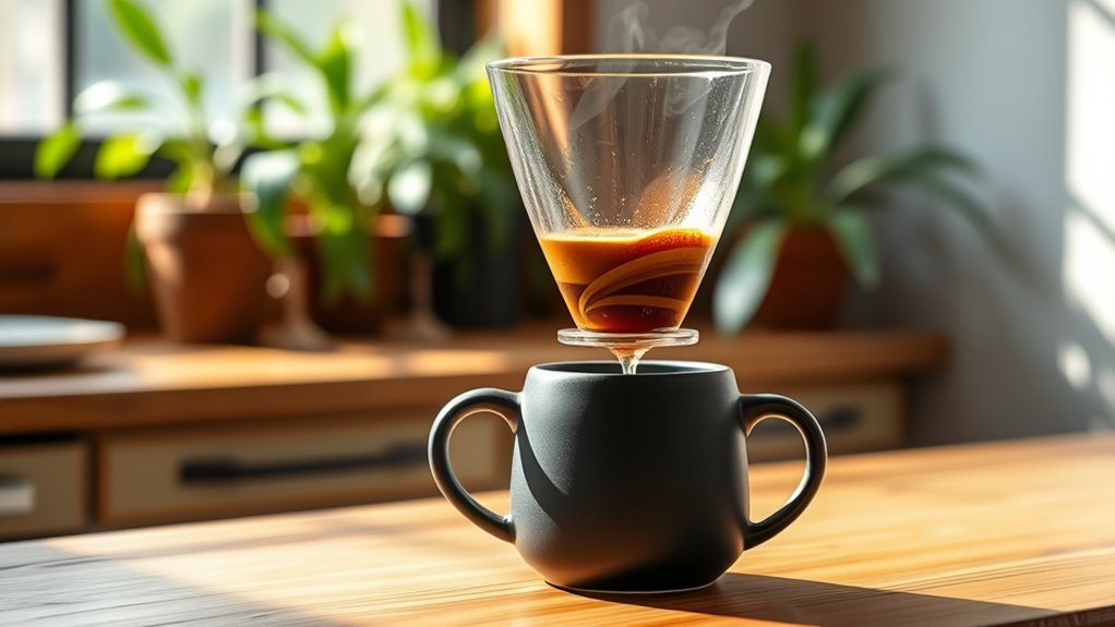The type of filter you choose can considerably influence the flavor, clarity, and body of your coffee. Metal filters, such as stainless steel or fine mesh, preserve oils, resulting in a richer, fuller-bodied brew. They’re reusable, eco-friendly, and easy to clean—simply rinse or run through the dishwasher. Paper filters, on the other hand, trap oils and micro-particles, producing a cleaner, brighter cup. However, they need to be discarded after each use, adding to waste and ongoing costs. Cloth filters provide a middle ground, offering reusability with a unique flavor profile. Compatibility is also key; most drippers fit standard #4 cone filters, ensuring a secure fit and effective filtration. Ultimately, your choice depends on your flavor preference and convenience priorities.