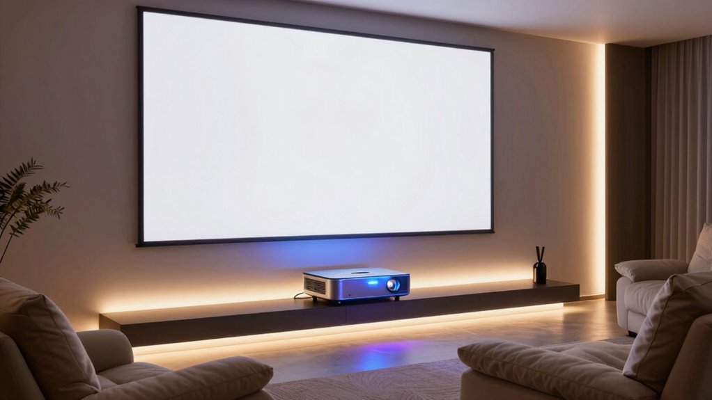 Have you ever wondered how brightness levels impact your home cinema experience? Brightness, measured in ANSI lumens, determines how well a projector performs in different lighting conditions. For well-lit rooms, I recommend projectors with 2,500 to 3,000 lumens to guarantee images stay vibrant and clear without dimming the lights. If your space has ambient light or you’re watching during the day, at least 2,500 lumens are ideal for maintaining image vibrancy. Lower brightness levels below 2,000 lumens tend to struggle in brighter environments, resulting in dull visuals. It’s all about balancing brightness with your room’s size and lighting—too much in a small room can cause eye strain, while too little in a bright setting means poor image quality.