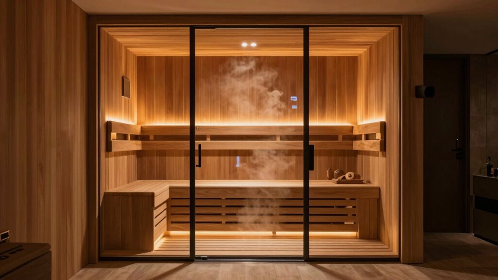 Selecting the right material for your indoor sauna can make a big difference in how long it lasts and how well it performs. High-quality woods like Canadian Hemlock are popular because they’re durable and provide excellent insulation, helping retain heat efficiently. Water-resistant materials, such as waterproof plywood or treated wood, boost the sauna’s lifespan by resisting moisture and warping over time. Tempered glass doors and panels aren’t just stylish—they’re more resistant to breakage, ensuring safety and longevity. Construction quality, including sturdy joints and high-grade finishes, also plays an essential role in durability. Additionally, regular maintenance like cleaning and inspecting for cracks helps preserve the materials’ integrity, ensuring your sauna remains safe and functional for years to come.