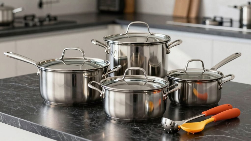 A cookware set that looks great can transform your kitchen’s overall vibe and make cooking more enjoyable. The visual appeal of cookware enhances your space and complements your decor. Bright, colorful exteriors or sleek finishes like granite or ceramic coatings add a modern or elegant touch. Thoughtful handle and lid designs should balance style with functionality, ensuring safety without sacrificing looks. Consistent design elements across the bundle create a cohesive, professional appearance, making your kitchen feel put-together. Minimalist designs appeal to contemporary tastes, offering clean lines and simplicity. Alternatively, intricate patterns or textured surfaces can add decorative flair. Ultimately, choosing cookware that matches your aesthetic preferences can elevate your entire cooking experience and reflect your personal style.