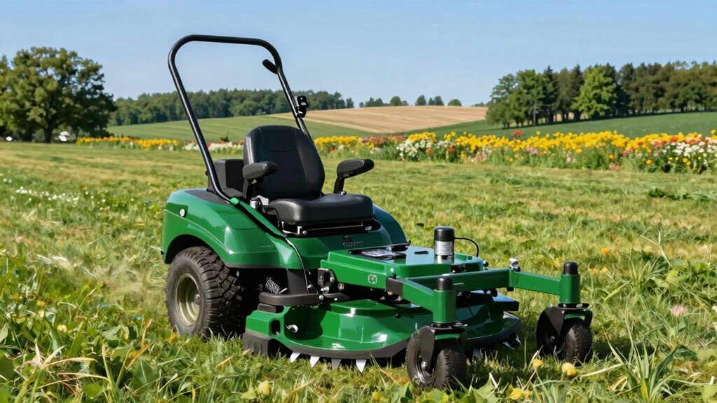 Have you ever wondered how the cutting width and speed of a riding mower impact your efficiency on large acreage? The cutting width determines how much grass you cover in a single pass—wider decks mean fewer passes and less time spent mowing. Speed, measured in miles per hour, affects how quickly you finish the job without compromising cut quality. Mowers with blade speeds around 17,000 feet per minute deliver cleaner, more even cuts. For extensive land, choosing a mower that can go at least 8 mph helps boost productivity. Striking the right balance between cutting width and speed is essential; a wider deck combined with higher speed can drastically cut your mowing time while maintaining precision. This guarantees your large acreage gets mowed efficiently and evenly.