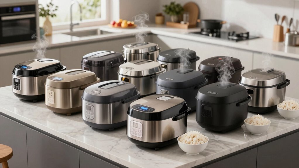 Many modern rice cookers come with a variety of cooking modes that can substantially enhance how you prepare brown rice. These modes, such as porridge, steaming, and slow cooking, add versatility and convenience. An automatic multi-phase cooking function adjusts temperature and timing to optimize texture and flavor for different rice types, ensuring perfect results every time. Specialized modes like GABA or multi-grain settings help boost the nutritional profile and improve the texture of brown rice. Additional features like delay timers and keep-warm settings support flexible meal planning and serve times. Having a rice cooker with diverse cooking modes means I can prepare more than just rice, making it a valuable tool for creating a variety of dishes and increasing overall kitchen efficiency.