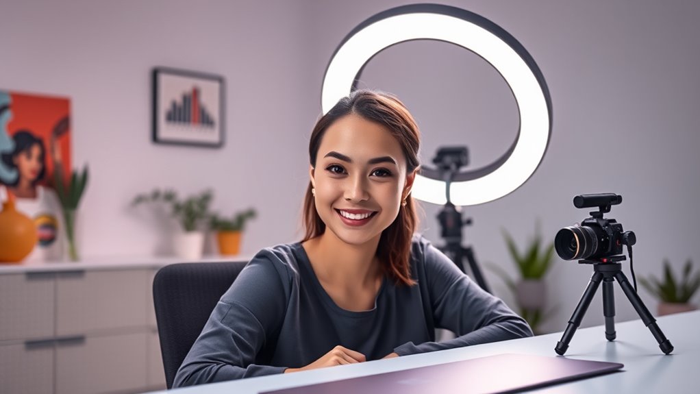 Choosing the right color temperature for your ring light can substantially impact the look and feel of your TikTok videos. Adjustable options, usually from 3000K to 6000K, let you switch between warm, neutral, and cool lighting to suit different scenes. Cooler temperatures (around 6000K) produce a bluish light that sharpens clarity, making your videos look professional. Warmer temperatures (around 3000K) create softer, more flattering tones that enhance skin appearance. Multiple settings give you the flexibility to experiment with different moods and effects, elevating your content. Smooth transitions between these options help maintain consistent lighting across various shooting scenarios without extra equipment. Overall, selecting the right color temperature helps reduce shadows and glare, ensuring your videos look natural and visually appealing.