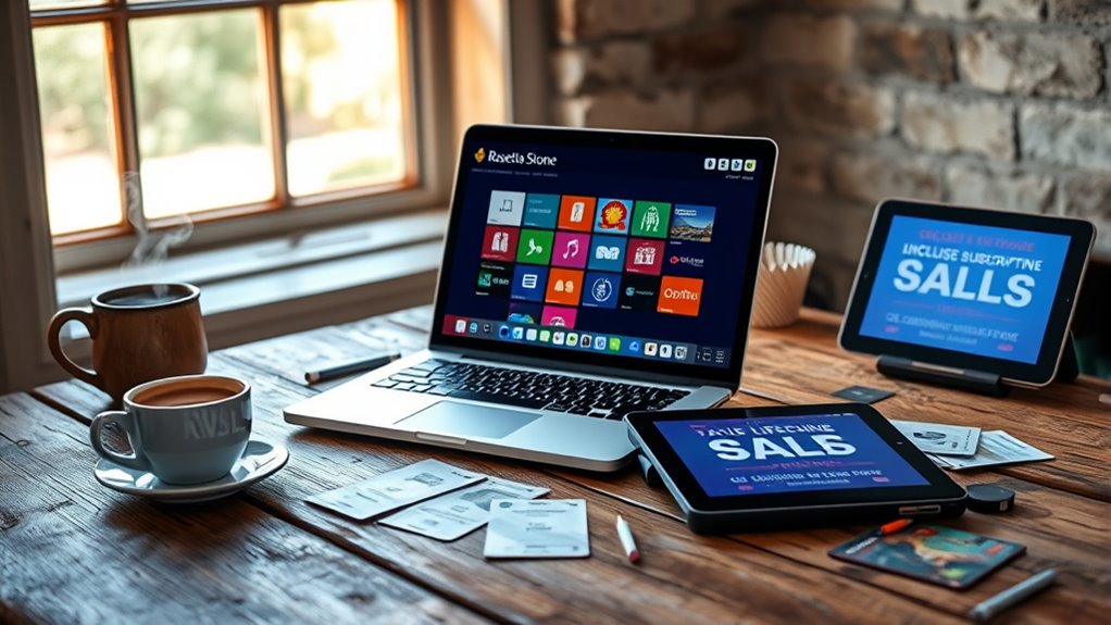 Looking for the best Rosetta Stone lifetime subscription deals in 2025? I’ve explored options offering all-encompassing access to multiple languages, including immersive courses with speech recognition, mobile support, and ongoing updates. These deals provide great value for sustained language learning without recurring payments. If you want to discover the top five deals, including what’s included and how to choose the right one, stick around—you’ll find everything you need to make an informed decision.