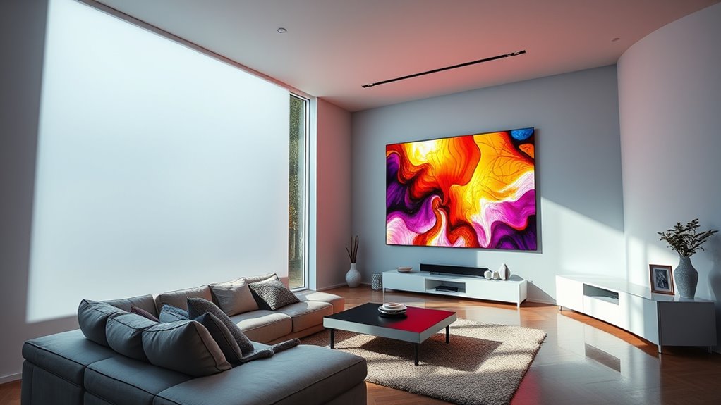 Brightness and contrast are essential factors to take into account when choosing a short-throw projector because they directly impact image clarity and vibrancy. Brightness, measured in lumens, determines how visible the image is in various lighting conditions. For well-lit rooms, look for projectors with at least 3,000 lumens to guarantee clear images. Contrast ratio, on the other hand, affects how well the projector displays dark and light areas, influencing the depth and richness of colors. A high contrast ratio, like 10,000:1 or more, makes images more vivid and detailed. Balancing brightness and contrast is indispensable—too much brightness without sufficient contrast can wash out images, while high contrast with low brightness might produce dim visuals. Achieving the right mix ensures a vibrant, sharp viewing experience.