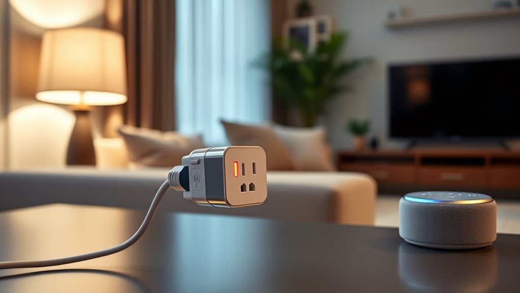 Since most smart plugs for Alexa connect via Wi-Fi, understanding their connection type and range is essential for reliable performance. Wi-Fi smart plugs usually operate on the 2.4 GHz band, which provides a stable connection across larger areas. In contrast, Bluetooth-enabled plugs have a limited range, typically around 30-50 feet, making them less suitable for larger spaces. The control range for Wi-Fi plugs can extend hundreds of feet, depending on your home network’s strength. However, physical obstructions like walls, furniture, and other electronics can weaken signals and reduce effective control distance. To overcome this, some smart plugs use mesh networks or repeaters, helping to extend their coverage throughout bigger or multi-story homes.