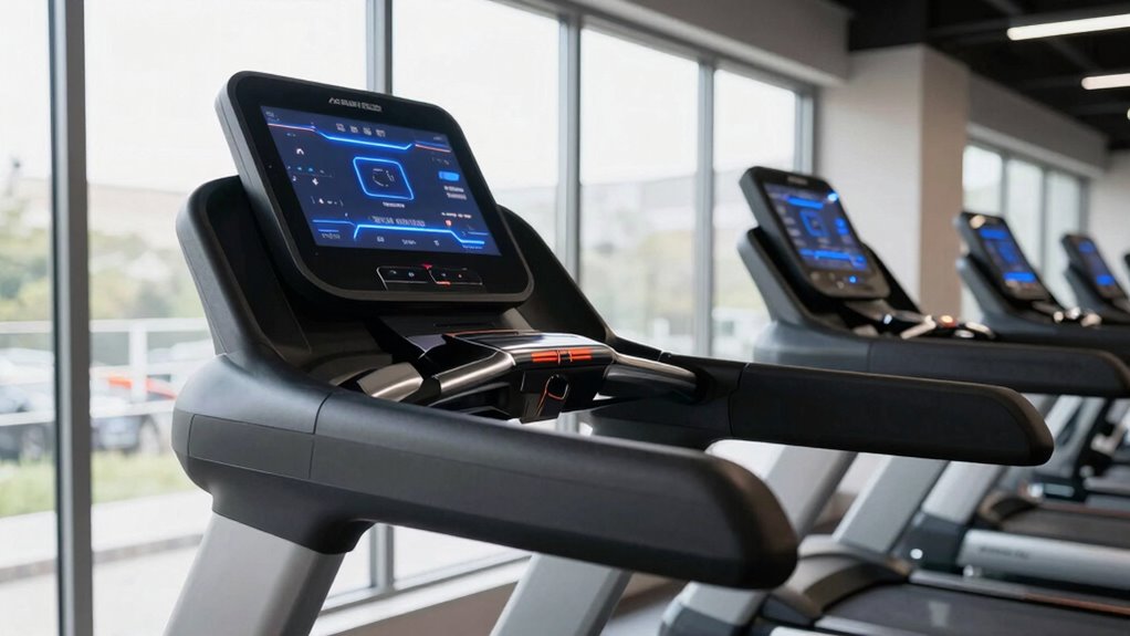 When selecting a smart treadmill, I consider how well it works with my devices and its range of incline and speed options to match my workout goals. I also look at the connectivity features, safety measures, and how clear the display and monitoring tools are. These factors help guarantee I choose a machine that’s safe, versatile, and easy to use.