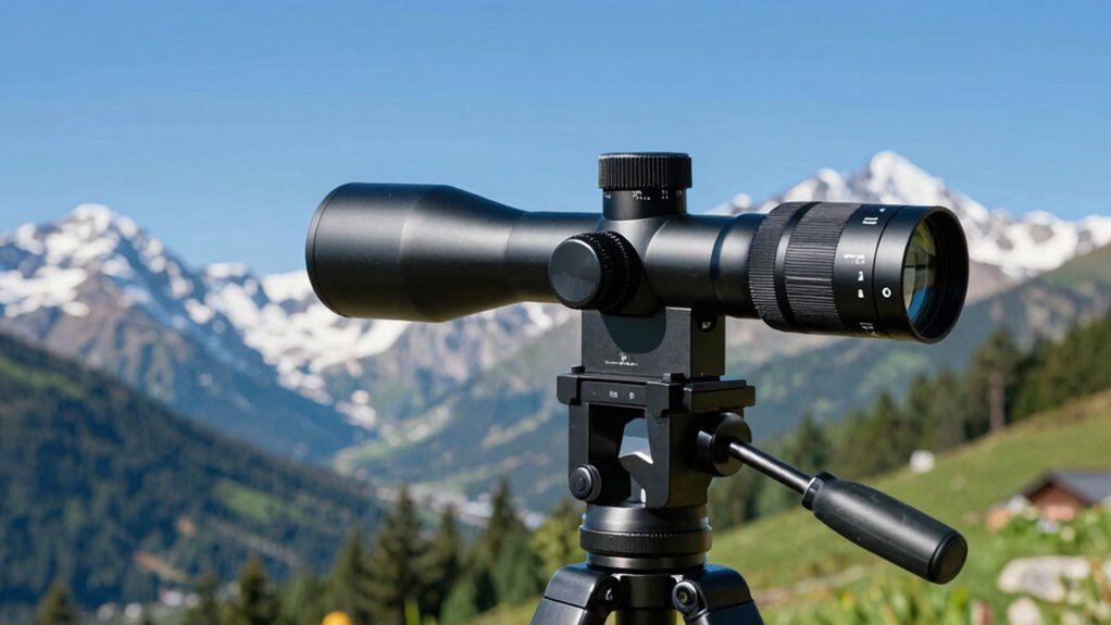 A versatile magnification range is essential for adapting to various observation needs, allowing you to switch seamlessly between wide-angle views and detailed close-ups. When a scope offers variability—like 20x-60x or 25x-75x—it becomes more adaptable for different distances and environments. Higher magnifications are great for long-distance viewing, but they often demand a stable tripod to prevent image shake. Lower magnification settings provide a broader field of view, making it easier to locate targets quickly. The ability to smoothly adjust magnification helps track moving subjects and enhances overall versatility. This flexibility guarantees you’re prepared for different scenarios, whether scanning a broad landscape or zooming in on distant details. A good magnification range ultimately makes your viewing experience more efficient and enjoyable.