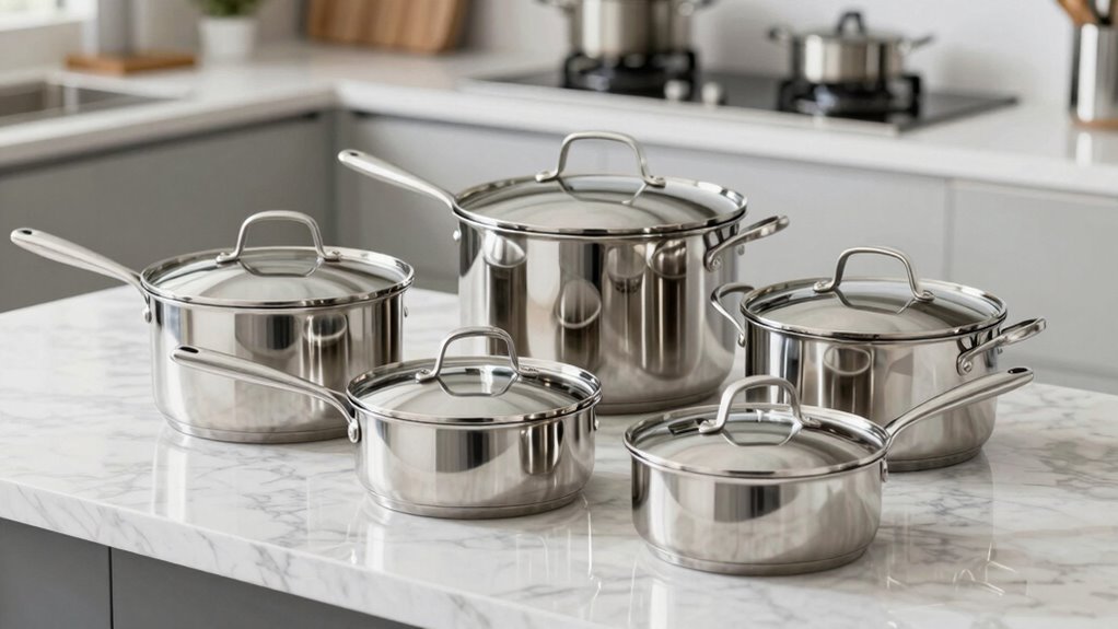 If you’re exploring the 15 best stainless steel cookware sets for 2026, I’ve got you covered. Top picks include reliable options like T-fal, Calphalon, ROVSUN, Martha Stewart, EWFEN, and others, offering a mix of durability, safety, and versatility. These sets feature multi-ply construction, oven and dishwasher safety, and ergonomic handles. Want to see which brands stand out and why? Keep going to discover all the key details you need.