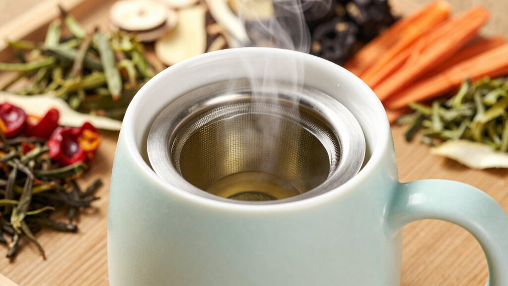 Selecting a tea infuser mug that looks good and feels comfortable in your hand can particularly enhance your brewing experience. I find that a design matching my style or kitchen decor, like elegant shapes or artistic patterns, makes my tea time more enjoyable. Ergonomically, a large, comfortable handle and balanced weight make pouring and holding effortless, reducing strain. The mug’s shape and size should allow for a firm grip and easy filling, with a wide opening for quick cleaning. A well-fitting infuser prevents leaks and spills, simplifying cleanup. Additionally, lids that double as infuser holders or offer heat insulation add both functionality and visual appeal. Prioritizing these aesthetic and ergonomic features ensures a delightful, hassle-free tea brewing experience.