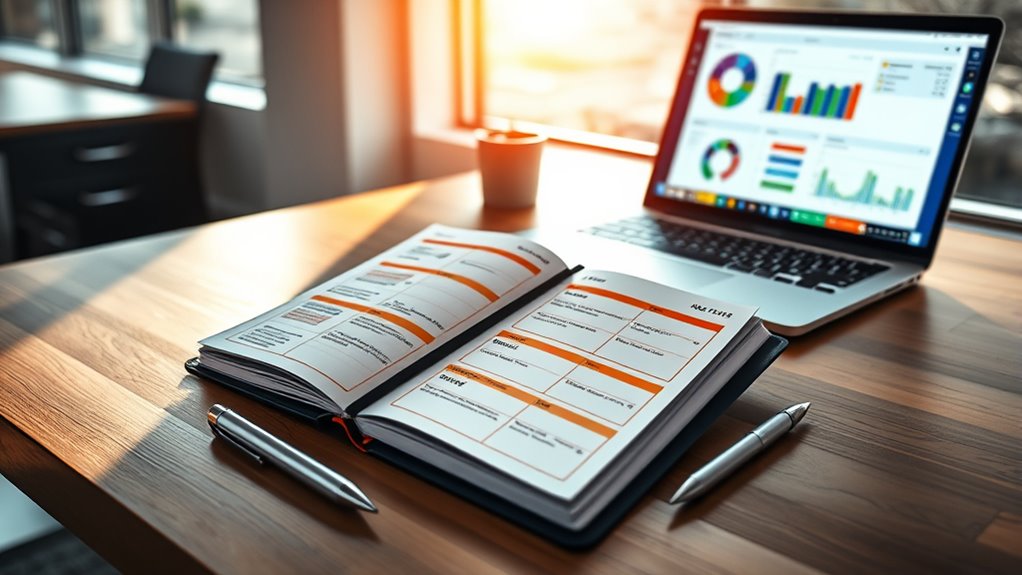 Incorporating additional planning tools into a time-blocking planner can substantially boost your productivity and help you stay on track with your goals. Features like habit trackers, goal-setting pages, and reflection prompts not only keep you focused but also encourage continuous growth. Many planners include sections for monthly reviews or progress trackers, supporting long-term success. Using complementary tools like sticky notes, digital calendars, or task management apps can provide extra flexibility and organization. Built-in features such as priority checklists or note spaces enable quick adjustments and more adaptable scheduling. Extra tools like goal templates, motivational quotes, or reflection spaces foster engagement and help sustain your planning habits. When choosing a planner, consider these tools to ensure your setup aligns with your productivity style and growth objectives.