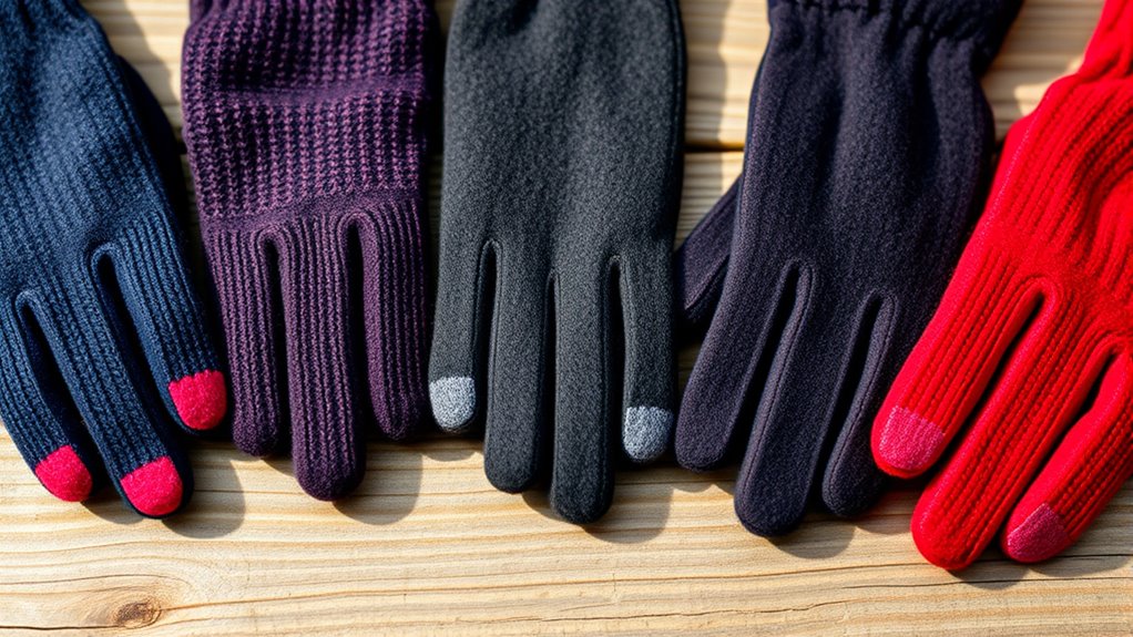 Ensuring your touchscreen gloves provide adequate insulation is essential for staying warm in cold weather, especially during outdoor activities. The right insulation, often from materials like wool, fleece, or thermal linings, traps heat and prevents it from escaping. Thicker insulation offers better warmth, but it can limit dexterity, so finding a balance based on your activity is key. Materials like alpaca wool or polyester fleece are excellent at reducing heat loss through conduction and convection. Layering gloves with insulating liners can boost warmth without sacrificing touchscreen sensitivity or mobility. Ultimately, the best gloves maintain heat over extended periods, even in freezing conditions, ensuring you stay comfortable and connected no matter how frigid it gets outside.