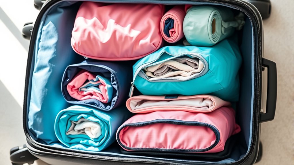 When it comes to maximizing the efficiency of your packing cubes, ease of access and visibility play a vital role. Transparent or mesh panels let you see what’s inside instantly, saving time and effort when finding specific items. Easy-to-use zippers with extended cords or dual zippers make grabbing clothes or accessories quick and smooth, even when your luggage is full. Organized compartments or color-coded sets help you identify different clothing types at a glance, streamlining both packing and unpacking. Clear or mesh tops further enhance visibility, so you don’t have to open each cube to locate what you need. Well-designed zippers with ergonomic pulls ensure effortless access, reducing frustration and making your travel experience more seamless.