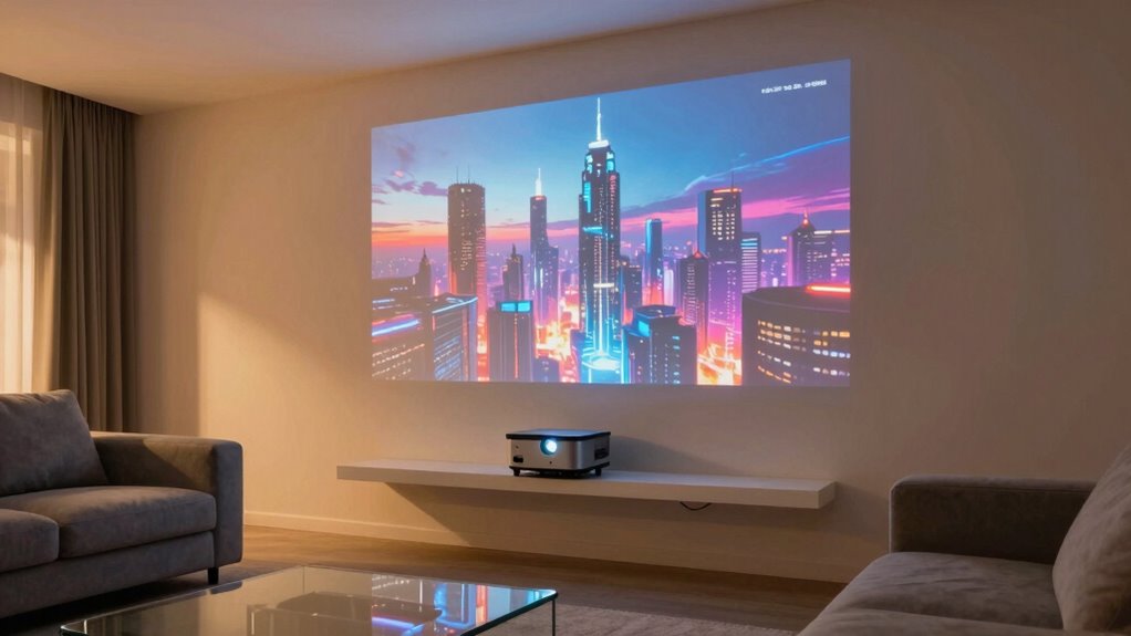 Ever wondered how much space you need to get a large, clear image from an ultra short throw projector? The good news is, these projectors are designed for tight spaces, projecting a 100-inch image from as close as 9 to 28 inches away, depending on the model. Adjustable zoom and keystone correction further enhance placement flexibility, allowing you to fine-tune the image’s size and alignment. Different models have varying throw ratios, meaning some require more or less distance for the same screen size. This flexibility is especially useful for small rooms or unconventional layouts, helping you maximize your space without sacrificing image quality. Ultimately, understanding throw distance options guarantees you choose a projector that fits seamlessly into your environment.