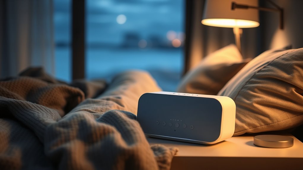 The noise-cancellation effectiveness of white-noise machines hinges on several key factors that influence how well they block out external sounds. First, the quality and variety of sounds matter—non-looping, natural sounds create better masking without noticeable repeats. Devices with adjustable volume levels allow you to fine-tune sound intensity, making it easier to drown out disruptive noises. Consistent, non-looping sounds provide more reliable noise masking, avoiding interruptions that can wake you up. Placement and directionality also play a vital role; placing the device to direct sound toward you or filling the entire room enhances noise cancellation. In conclusion, high-quality sound production with clear, crisp audio minimizes distortion, ensuring external noises are effectively masked, helping you sleep peacefully through the night.