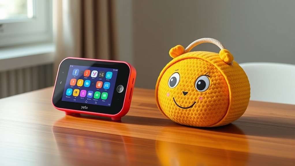 When evaluating the Yoto Player and Toniebox, I consider how their design and durability can influence long-term use, especially for active little ones. The Yoto Player has a sturdy plastic body with a reinforced front panel, making it resistant to drops and rough handling. Its large, tactile controls are easy for small children to operate, adding to its practicality. In contrast, the Toniebox features a soft, rubberized exterior that absorbs shocks, offering extra protection during play. Its smooth, rounded shape encourages safe, hands-on interaction. Durability testing shows both devices can handle typical preschooler activity, but the Toniebox’s soft exterior provides an extra layer of protection. Overall, both are built to last, but their unique designs suit different types of active use.