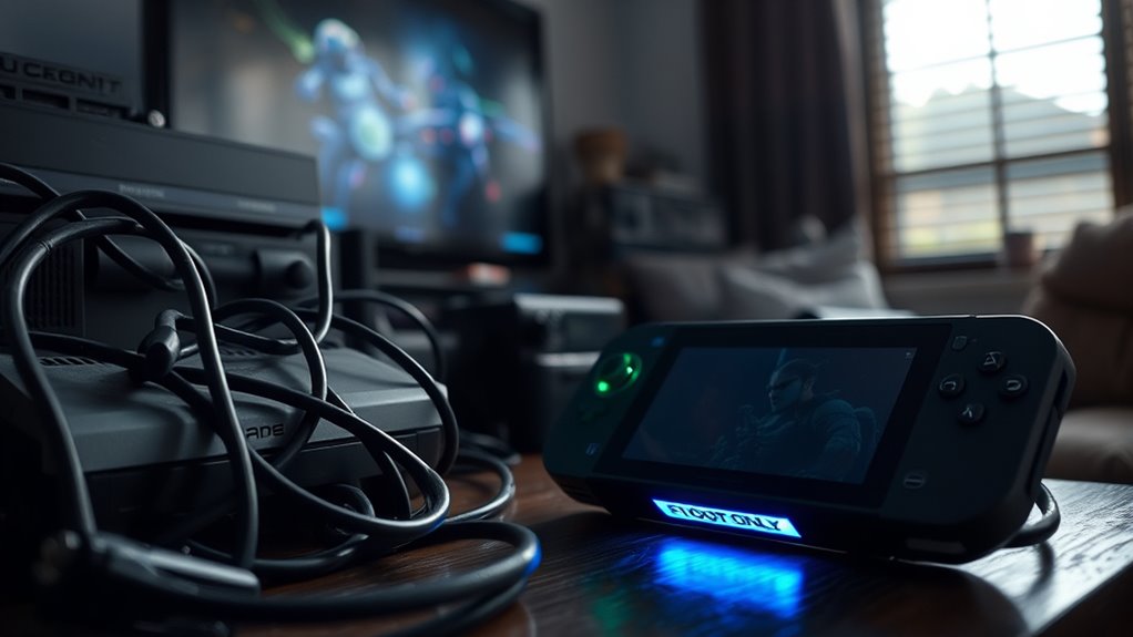 Subscription services have revolutionized gaming by offering instant access to a vast library of titles for a fixed monthly fee. But as you subscribe to more platforms, you may experience subscription fatigue—feeling overwhelmed by multiple memberships and recurring costs. Despite this, many gamers stay because of the appeal of exclusive content, which isn’t available elsewhere. These services often release new or exclusive titles, making it tempting to stick with their ecosystems. However, the abundance of options can also lead to decision paralysis, pushing gamers toward more streamlined cloud or handheld solutions. Ultimately, subscription services influence your gaming choices by shaping your library, encouraging continuous engagement, but also risking burnout from managing numerous subscriptions.