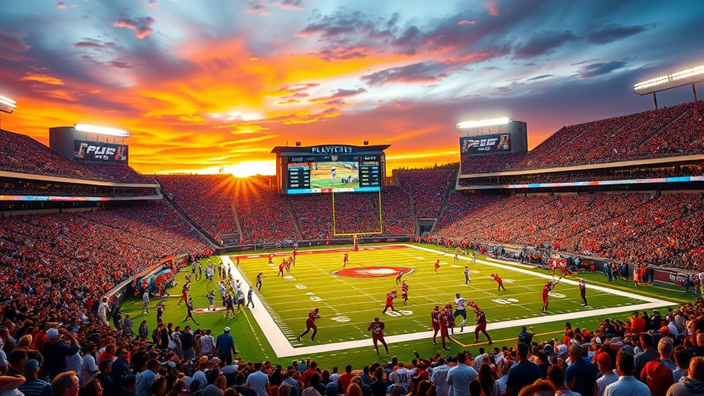 In 2025, the college football playoff picture is shaped by smarter recruiting, innovative coaching staff changes, and tech advances that boost fan experience. Schools focus on data-driven scouting and international talent, driving up competitiveness. Coaching stability and strategic player development are vital for postseason success. Transfer portal moves and NIL deals also influence rankings and team strength. To understand how all these factors impact the playoff landscape, keep exploring the latest trends shaping college football.