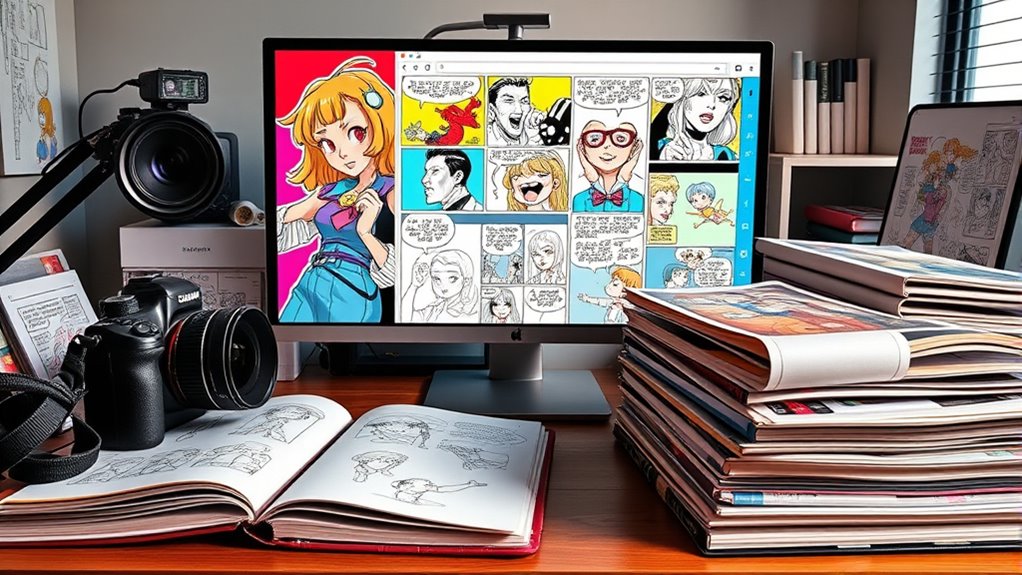 Digital innovations have transformed comics and webtoons from traditional printed pages into vibrant, interactive stories that reach a worldwide audience through screens. You can experience stories with vertical scrolling, animations, and high-quality visuals on smartphones and tablets. Platforms encourage community sharing, real-time updates, and creator engagement, making stories more dynamic than ever before. If you keep exploring, you’ll discover how these digital pathways continue to reshape storytelling possibilities across the globe.