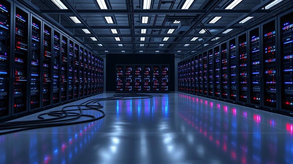 As digital demands grow, your data center faces increasing energy needs that can overwhelm existing power supplies. This surge not only risks operational stability but also highlights the critical importance of renewable energy sources and innovative cooling technologies. Integrating solar, wind, and advanced cooling methods helps you cut reliance on fossil fuels, stabilize costs, and boost resilience. Staying ahead involves understanding these solutions; continue exploring to see how you can address the power crunch effectively.