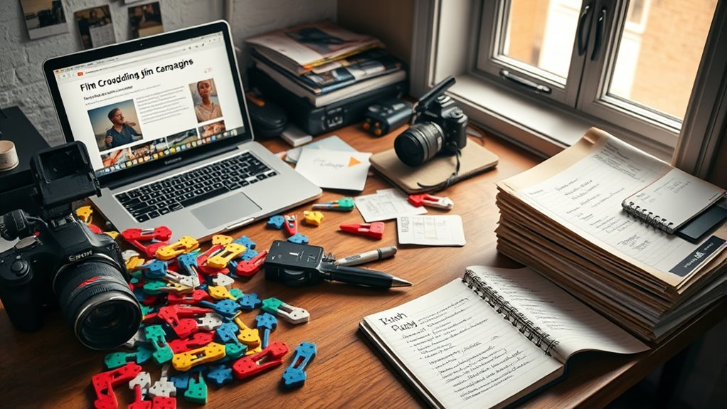 You can secure funding by exploring crowdfunding platforms like Kickstarter or Indiegogo, where you share your project and attract individual supporters. Additionally, seek out private grants from arts organizations, foundations, or film funds that support documentary filmmaking. Craft a compelling pitch, build a strong network, and demonstrate your project’s social impact to increase your chances of securing the necessary funds. Combining these strategies boosts your project’s financial foundation.