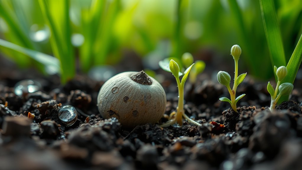 You might wonder how these tiny seeds “know” what’s happening around them. It’s all about their innate ability to respond to environmental cues. Inside the seed, chemical signals and physical structures act as sensors. When the right signals are detected, they initiate a cascade of biochemical reactions that weaken seed coats, activate enzymes, and begin cell division. This coordinated response guarantees that sprouting occurs at the ideal moment, giving the seed the best chance of survival. Interestingly, research shows that some seeds can even sense fire cues, which can break dormancy in fire-adapted ecosystems, ensuring germination occurs after a disturbance.