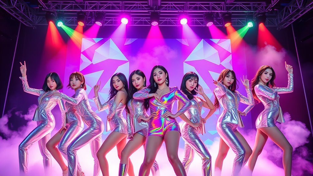 Virtual idols will likely become more mainstream in 2025 as fans embrace digital personas. You’ll see more virtual idols with realistic animations and interactive features, blurring lines between real and digital artists. Agencies are investing in advanced AI and virtual production, making these digital personas more engaging. As technology improves, virtual idols will connect with audiences on a deeper level, establishing a stronger presence in the global music scene.