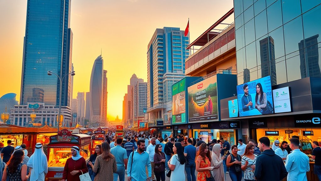 At the same time, cultural heritage remains a cornerstone of regional identity and a key component of economic diversification. The Middle East is rich with ancient sites, museums, and traditions that draw millions of tourists each year. Countries are actively working to preserve their cultural assets while making them accessible to visitors. This includes restoring historic landmarks, promoting local crafts, and hosting festivals that celebrate their unique histories. These efforts boost tourism revenue and foster a sense of pride among residents. You’ll see that cities like Dubai and Doha are blending modernity with tradition, creating vibrant spaces where history coexists with innovation. This balance is essential, as it guarantees that development respects local identities and promotes sustainable tourism practices.